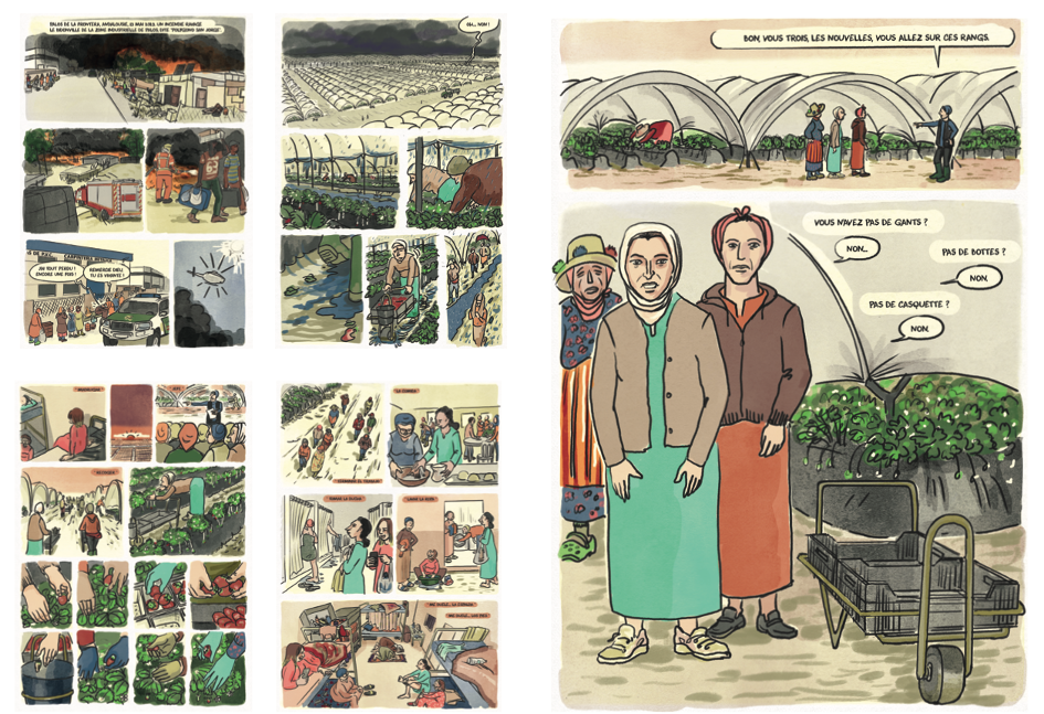 S’inspirant de l’enquête de terrain réalisée par la chercheuse Chadia Arab, ces planches illustrent les conditions de vie et de travail de ces « dames de fraises » choisies pour la précarité de leur situation et parce qu’elles laissent chez elles des enfants qui les contraindront à revenir.